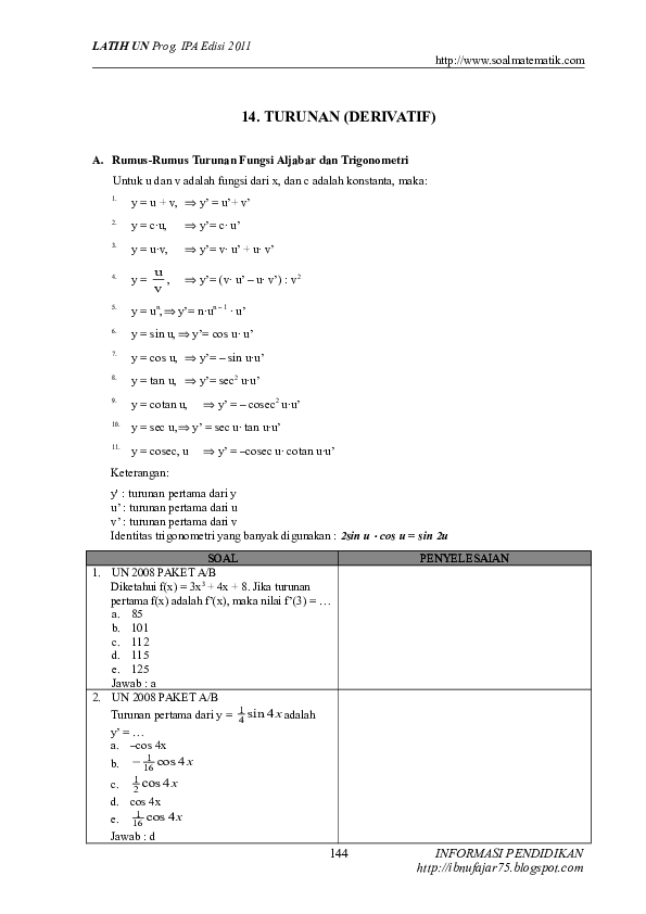 Bagi teman teman yang sedang mencari soal soal turunan fungsi trigonometri berikut ini saya share beberapa soal yang saya miliki soal turunan fungsi trigonometri berikut ini berformat pdf pastikan pada smartphone atau pc teman teman sudah ter install aplikasi pdf reader seperti foxit adobe reader dan sebagainya. Soal juga dapat diunduh dalam format pdf melalui tautan berikut: 12x 2 + 6x + 2. Turunan suatu turunan fungsi yang ditulis dengan notasi dengan rumus. Download file bab aplikasi turunan a.persamaan garis singgung kurva persamaan garis singgung kurva bentuk umum nya adalah:
