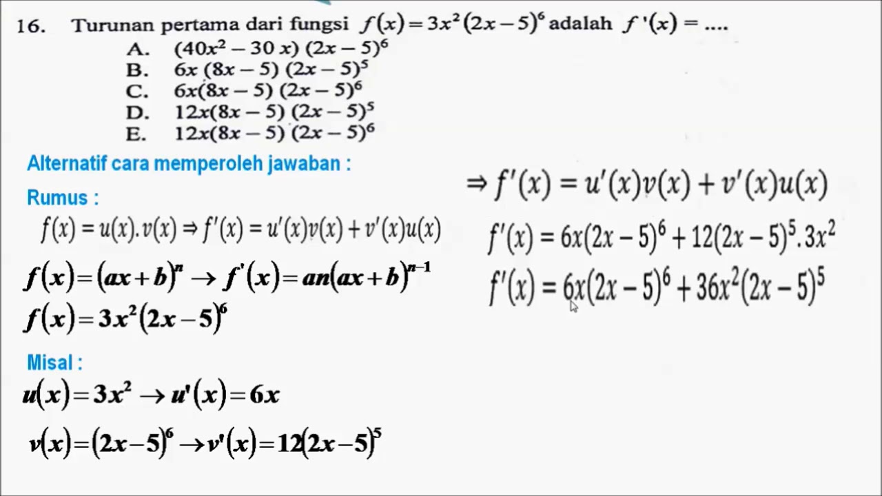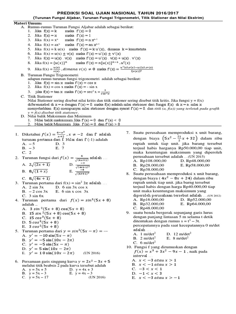 Soal Un Turunan - Contoh Soal Turunan Fungsi 2 Idschool : Pembahasan soal ujian nasional (un) sma bidang studi matematika ipa tentang aplikasi turunan dalam pemecahan masalah yang berkaitan dengan maksimum dan minimum.. Sebelum masuk ke topik utama, kita akan melakukan review singkat tentang fungsi turunan atau diferensial. Fungsi f naik dalam interval. Berikut ini koleksi bank soal seleksi perguruan tinggi negeri atau sbmptn materi turunan/diferensial dari tahun 1992 sampai 2017 dengan jumlah 93 butir soal: Soal juga dapat diunduh dalam berkas pdf melalui tautan berikut: Untuk menentukan turunannya, digunakanlah aturan rantai.